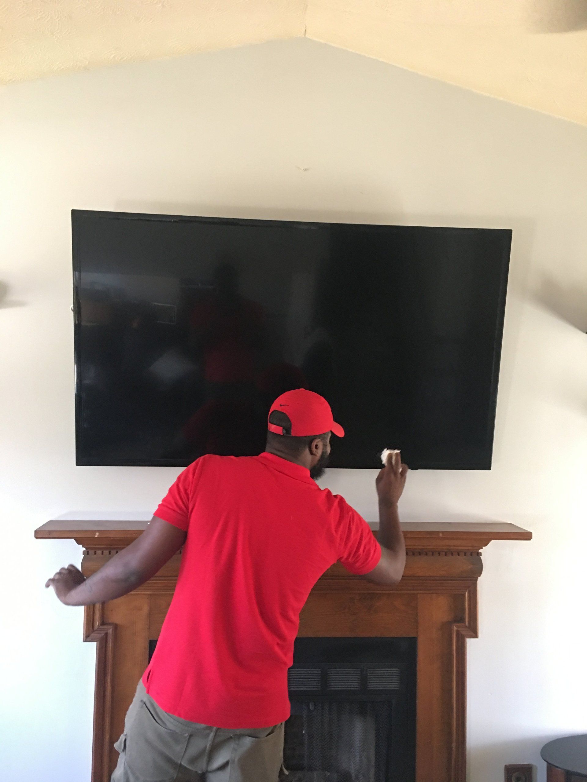 Your TV will be installed. The wires and cables will be organized and hidden through the white cord mate strip that sticks to the outside of the wall,